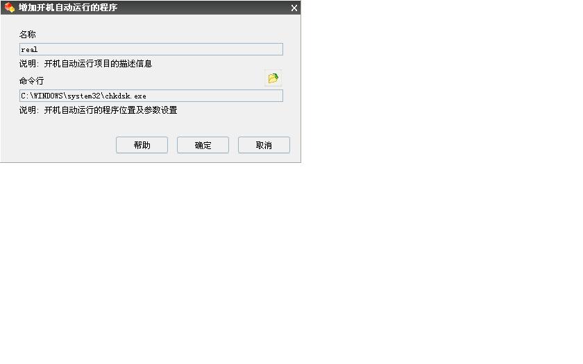 图三是填写启动项名称和增加所要自启动的文件,名称设为real,命令行那里点那文件夹,选项任何的文件,你可以新建一个空白文档,0字节都行.我增加的是的系统自带的磁盘检查程序,
