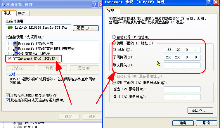 桌面→“网上邻居”→击右键→选取“Internet协议(TCP/IP)”→“属性”→激活点击下面的“使用下面的IP地址”参见下图片所示