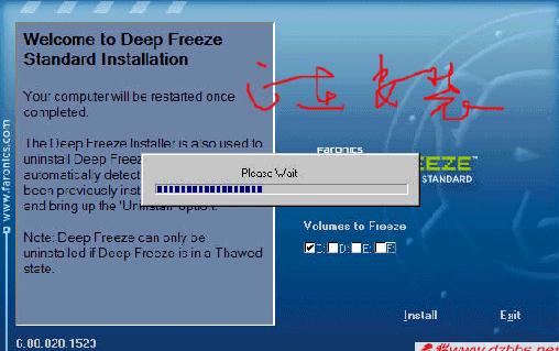 运行DF安装文件,选择需要冻结也就是需要保护的分区。一般来说,我们主要保护C盘就够了。然后进行下一步再下一步。然后程序就开始“Please wait”,待Please wait完了,机器会重新启动,启动起来以后,由于是安装后第一次启动,DF会对系统进行一次扫描,这时候机器可能会变的很慢,几乎无法操作,不要着急,Please wait一小会儿就OK了