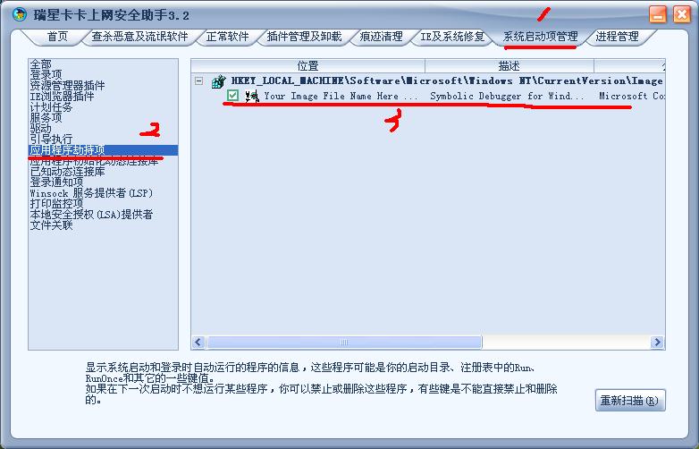 还有一种可能,中毒,被应用程序劫持(IFEO)了。杀毒后删除下图3处红线标志注册表子项目