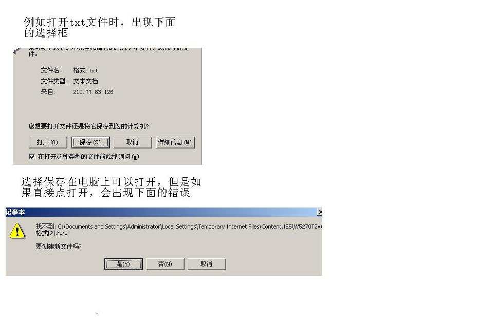 点击附件,IE弹出下载确认对话框,可以选择保存或者直接打开。附件可以正常下载保存,但选择直接打开时,附件也正常下载,但下载完打开时却总是报错说文件不存在。选择下载后打开的word或excl老是提示应该保存在临时浏览文件夹下文件不存在.