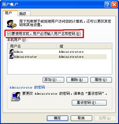 后者在进入系统后,开始--运行--输入control userpasswords2--回车--取消下图红框中的DD的勾选--确定--要求选择一个缺省登陆的帐户(建议不要选择超级管理员帐户)--确定,下次开机就不要求你输入密码了。