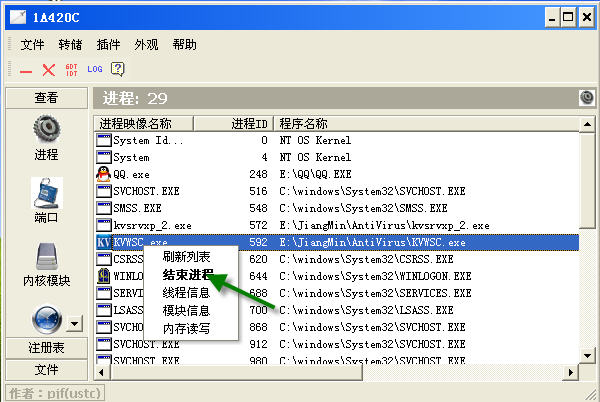 后,"RavTask.exe, RavMonD.exe"赫然出现..Rav不正是可爱的瑞星的进程名称么,看来只有结束这两个进程了...又被告知没有"没 有 权 力"...