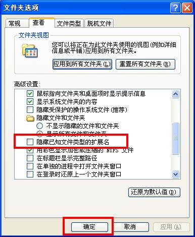 具体设置方法很简单,双击“我的电脑”--工具--文件夹选项--查看--在列表中找到“隐藏已知文件类型的扩展名”这个项目,取消勾选,之后点下方的“确定”,效果如下图: