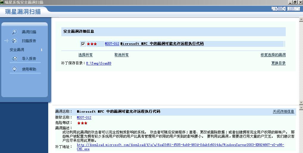 主要问题应该在瑞星.20.21.01版本根本就没有提示.之后的新版本提示有该问题.按照微软的UPDATE时间,每个月第二周的星期二出补丁.那么本次的升级中也不包含该漏洞.真奇怪的瑞星.估计瑞星技术员头脑发热吧.有环节写错了.哎.