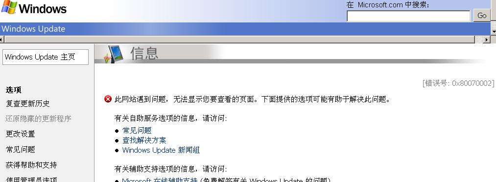 用的是随机子的正版,所以才有胆进WindowsUpdate的页面,最近点了“快速”或“自定义”后,都是绿色进度条一闪然后页面变成如图样。说错误号0x80070002,在微软里查了一圈也没个能治的好像。前阵子中过灰鸽子,不知道是不是留下的后遗症?请高手指点,谢了先。