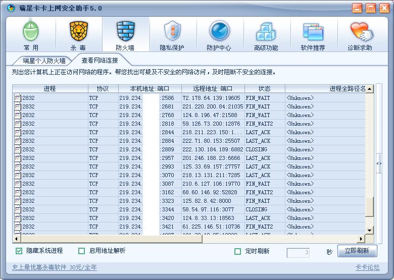 用瑞星看到的奇怪的网络连接,但在进程中却找不到.瑞星20.23.52查不到病毒.