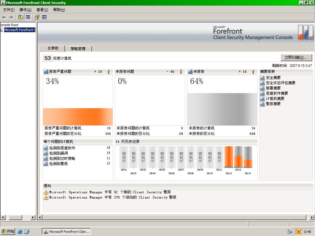 Microsoft Forefront Client Security 向商用台式机、便携机和服务器操作系统提供易于管理与控制的统一恶意软件防护功能。可以防范间谍软件、Rootkit 等新威胁,以及病毒、蠕虫和特洛伊木马等传统威胁,并通过提供用一个中央管理方式来提供简易管理,提供至关重要的威胁和漏洞可见性,可以与 Active Directory 等已有基础架构软件集成,并对其他Microsoft 安全技术发挥补充作用,实现强化的保护和更大的控制。