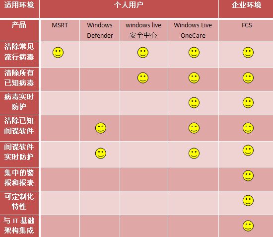 微软涉足反恶意软件、反病毒软件由来已久,先后也推出了不少产品,我们就来对比一些有代表性的产品:MSRT、Defender、Live 安全中心、Live OneCare