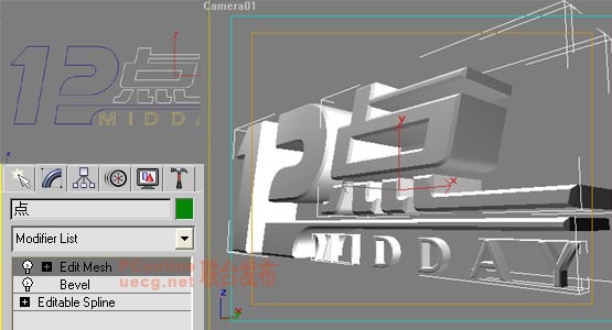 2.在3DSMAX中建立标志的模型。用line勾线做出标志然后将其bevel,调整参数,建立如图场景模型。