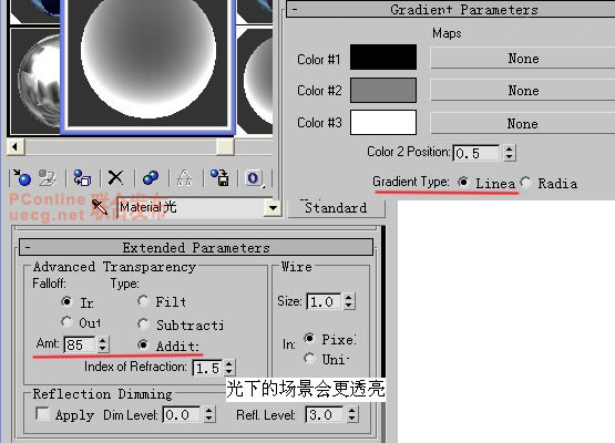 7.制作long字上的假质量光(渲染速度快易控制)使用Gradient(渐变)做透明贴图来制作