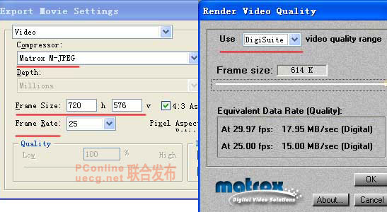 10.使用premiere把图象和声音合成输出,以 Matrox DigiSuited的板卡为例,输出Matrox M-JPEG的文件格式:尺寸720/576 每秒25帧,象素比是1.067 声音是4800Hz 16Bit-Stereo,最后输出到Betacam磁带上。