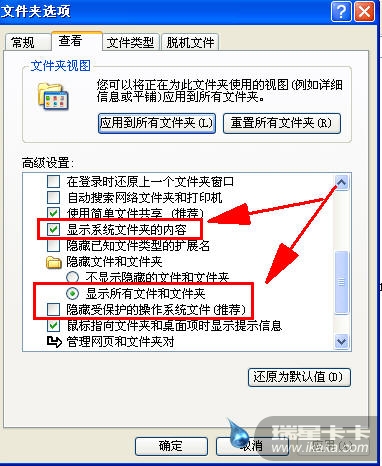 打开【我的电脑】--工具--文件夹选项--查看--去掉【隐藏受保护的操作系统文件】前的对号,选中显示所有文件和文件夹。点击确定