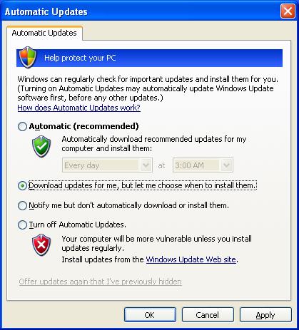 永远也不要打开自动更新,要更新系统打补丁可以通过第三方软件进行,如:瑞星卡卡或金山清理专家.我的自动更新从来都没开过,