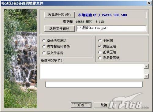 在备份分区时,在指定好源分区和文件路径后,还需用户根据自己的需要,选择按所有扇区、存储结构或文件的备份任务,以及压缩类型。如有需要另外说明的内容,用户还可以加以800字节以内的备注。