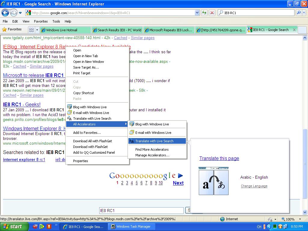 昨天更新我的windows live space的时候顺便看了下邮件,打开neowin网站的首页看到了微软的IE8 RC1发行了,嗯。。。终于发行了,我这个英文系统被这个IE8 beta2 拖的太慢了,毕竟是beta版多少有些差强人意的地方,于是马上到微软的官网下了IE8 RC1的安装程序。下载运行后要求重启,重启后先卸载以前版本的IE然后搜索更新然后安装然后重启。相当于装这个IE8需要重启2回,重启后发现我的系统发生了一点小变化,本来我是在任务栏选择了“快速启动栏”的,装完IE8后重启进入系统发现“快速启动栏”隐藏了。至于别的变化我还没发现,不过这个RC1确实比beta2版要快,不管是反应还是浏览网页的速度都要流畅。