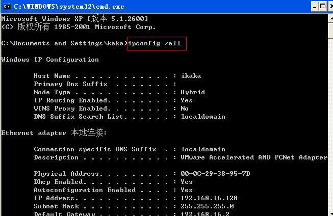 ipconfig /all--当使用all选项时,IPConfig能为DNS和WINS服务器显示它已配置且所要使用的附加信息(如IP地址等),并且显示内置于本地网卡中的物理地址(MAC)。如果IP地址是从DHCP服务器租用的,IPConfig将显示DHCP服务器的IP地址和租用地址预计失效的日期(有关DHCP服务器的相关内容请详见其他有关NT服务器的书籍或询问你的网管),其输出信息见图6的下半部分。