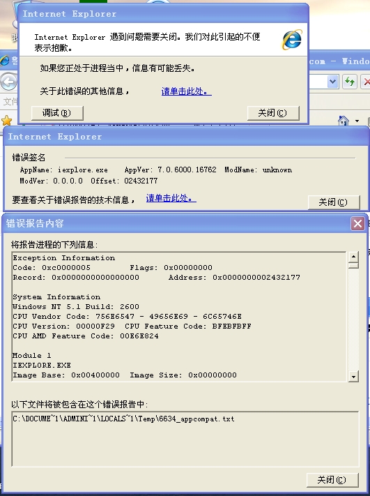 本人用sp3系统、IE7.0,在关闭网页时,老出现下面第一张图片的现象,第二张和第三张是根据第一张的“请单击此处”所获得的图片信息,望班竹解决为盼!