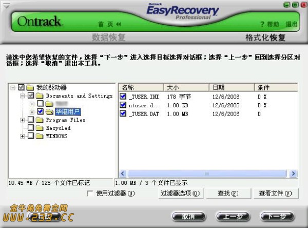 (2)找一张DOS下的支持NTFS 的EasyRecovery光盘,使用EasyRecovery 找回账户配置文件(具体能不能找回该配置文件,就要看大家的运气了,还好我的运气不错,找到了,不然就不知道怎么向MM交代了,呵呵)。然后把找到的用户配置文件另存到D盘。(如图1)