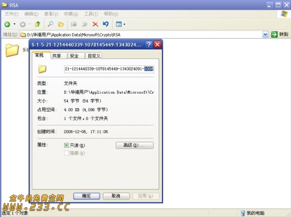 (4)再造SID,首先确认帐户的SID,这里可以进入以下文件夹:D:\华港用户\Application Data\Microsoft\Crypto\RSA在其下应该有一个以该帐户的SID为名的文件夹,例如是S-1-5-21-1214440339-1078145449-1343024091-1004(RID为1004)现在我们要设法让新建帐户同样具有1004的RID,这样就能达到目的。如图2