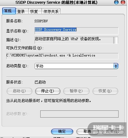 楼主可以右键单击我的电脑在管理中选择服务和应用程序/服务,找到SSDP Discovery Service这个服务,右键查看属性。将启动类型改为手动即可。如下图: