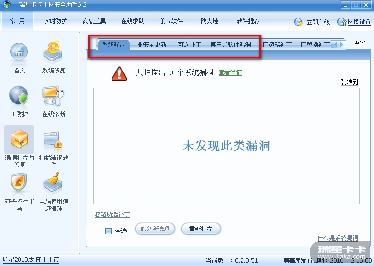卡卡扫描出来的补丁分为三个部分,需要都打开检查一下。