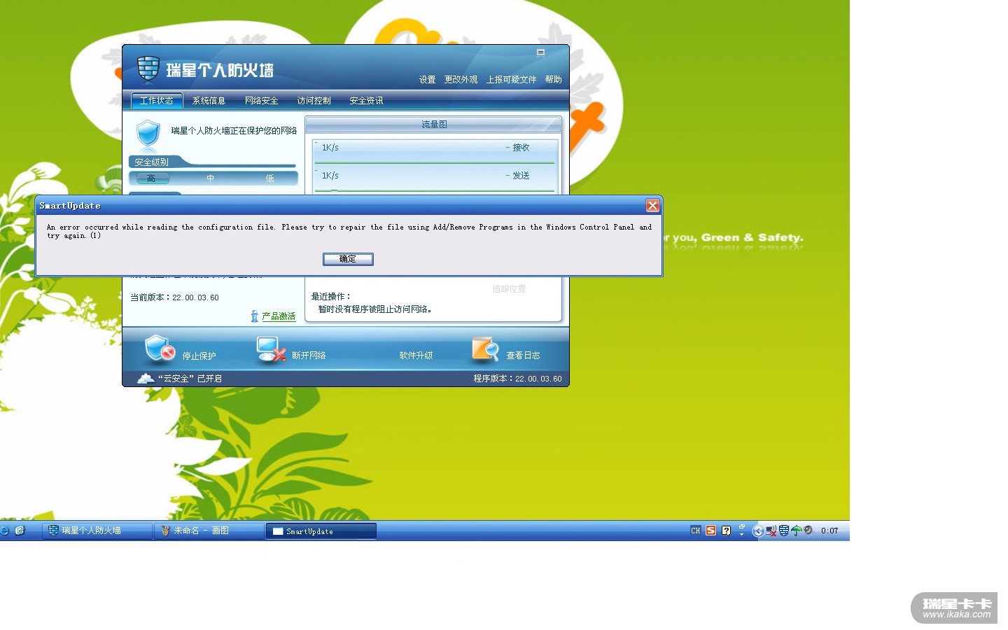 紧急求助:瑞星无法打开,修复后仍无反应,致使桌面所有软件失灵,瑞星防火墙不能升级,现截图和日志如下,希望高人指点!