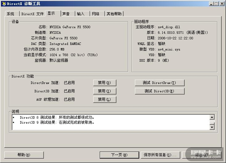 我的显卡是GeForceFX5500,具体参数见图