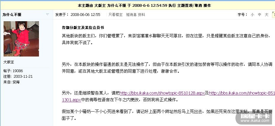 此事二人都有责任。为什么不懂作为大版主,发帖中含不敬词语;楼主即便是玩笑,也应注意尺度,尊重他人。