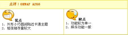 另外,针对女孩们对于星座运程的热爱,特别内置了“星座解说”、“星座生肖”、“星座速配”、“星座求职”、“星座网络情缘”、“星座美丽手册”,血型则包括四种主要血型的优缺点和相关特征,花语包括多种常见鲜花的寄语。 基本参数 型号 A268 上市时间 2005 手机类型 折叠 网络制式 GSM 900/1800 外形参数 体积 80×40×22.6mm 重量 80克 外壳颜色 粉红色 外屏参数 彩屏,65536色,96×64像素 主屏参数 彩屏,65536色,128×128像素 电池 锂电池(760mAh) 基本功能 通话时间 150-300 分钟 待机时间 80-150 小时 铃声 40和弦,自编铃声:5首,支持铃声格式:mmf,i-melody,midi 通讯录 分组管理,500条×5项,一笔5个号码,单键即可快速分类查询 短信息 SMS短信,MMS短信,可储存500条,支持Smart Message格式短信 游戏 内置游戏 主要功能 内置震动,内置天线,语音拨号,时钟,情景模式,来电大头贴,短信警卫 附加功能 闹钟,日历,计算器,记事本,世界时钟,精选英汉词典,汇率换算 数据应用功能 数据业务 GPRS Class 10,GPRS 高级扩展功能 摄像头 内置摄像头,30万像素,CMOS传感器 拍摄功能描述 可储存20幅相片