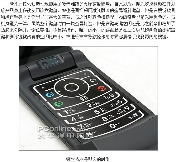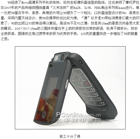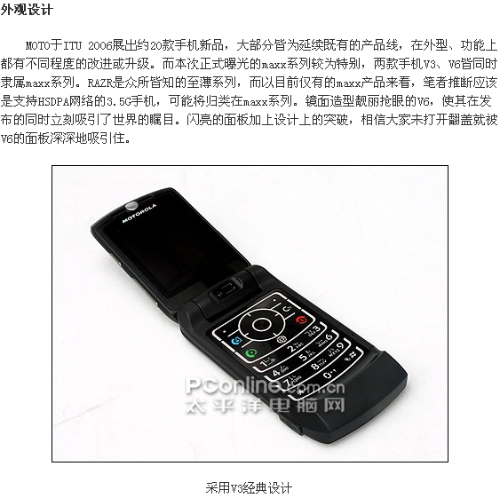 摩托罗拉V3取得空前得成功,尝到巨大利益甜头得摩托罗拉继而对其手机外形提出了“3米法则”,就是让用户在3米的距离上就能认出是摩托罗拉的手机。基于此法则,摩托罗拉近期推出得产品都很有看头。摩托罗拉V6之前在网上流传得消息可谓是漫天飞舞,PConline手机频道就曾作出过几个相关的报道。现在,我们PConline手机频道拿到了摩托罗拉RAZR系列首款3.5G手机V6之后,我们马上就为大家送上这款拥有犀利锋芒的摩托罗拉maxx V6详细评测报告。