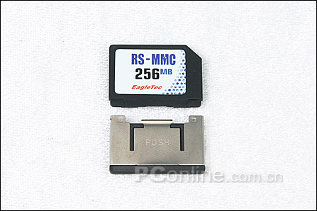 RS-MMC即Reduce Size MMC,也就是缩小尺寸的MMC卡,除了体积缩小外,它的主要性能与标准MMC卡完全一样。通过随卡赠送的转接器可以达到MMC卡的标准尺寸,也就是说RS-MMC卡可以通过转接器在支持MMC卡和SD卡的手机上使用。