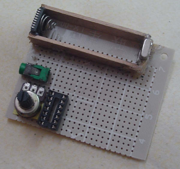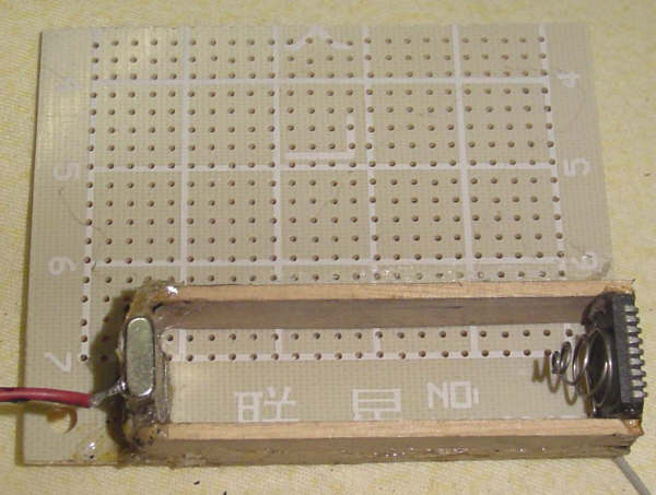 找到合适的木盒子,是装打火机的木盒子,电路板按照它的尺寸切割的,由于路上捡到一个充电电池,不要浪费了,就用这个供电,不要USB取电,不要键盘口取电,不要显卡接口供电,更加不要外接一个变压器,电压不够的问题可以通过升压电路解决,反正耗电不大。这就是电池盒,弹簧是以前留下来的,后面垫的是光驱的BIOS芯片,正极是大晶振,声卡拆的^_^ ,奢侈啊,两边是冰棒的木棍,还有好用便宜的热熔胶,一个实用的电池盒做好了。