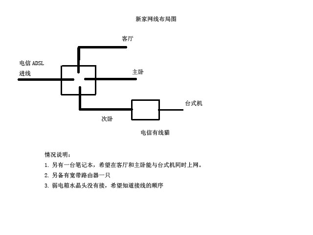 n你可以选用一款DLINK的无线路由器路由器,然后你把你的猫的WAN外网线接在无线路由上的WAN口上,但无线路由最好位置放在主卧室那因为如果接在远的地方的话笔记本的接受信号强度会很弱,网速很慢,因为有墙等障碍物的阻隔,所以无线路由器最好离笔记本近一点越近越好