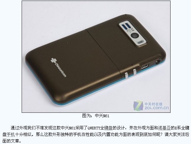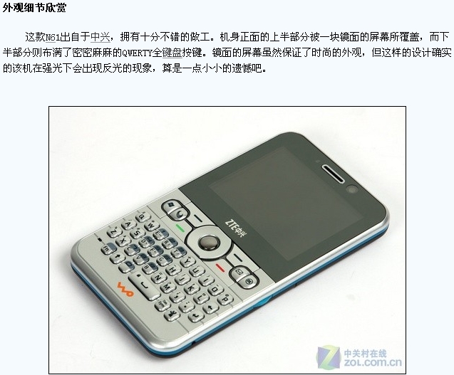 正是基于以上的历史背景使得全世界的手机厂商们都将中国的3G市场作为了自己的战略重点,而作为民族企业的国产厂商自然也不甘示弱,准备借着主场优势和国外厂商进行一场正面的碰撞。今天我们中关村在线手机频道就收到了来自中兴的一款支持WCDMA网络的3G手机N61,该机也将作为联通的3G定制手机推向市场。下面让我们首先来看看这款产品的外观。