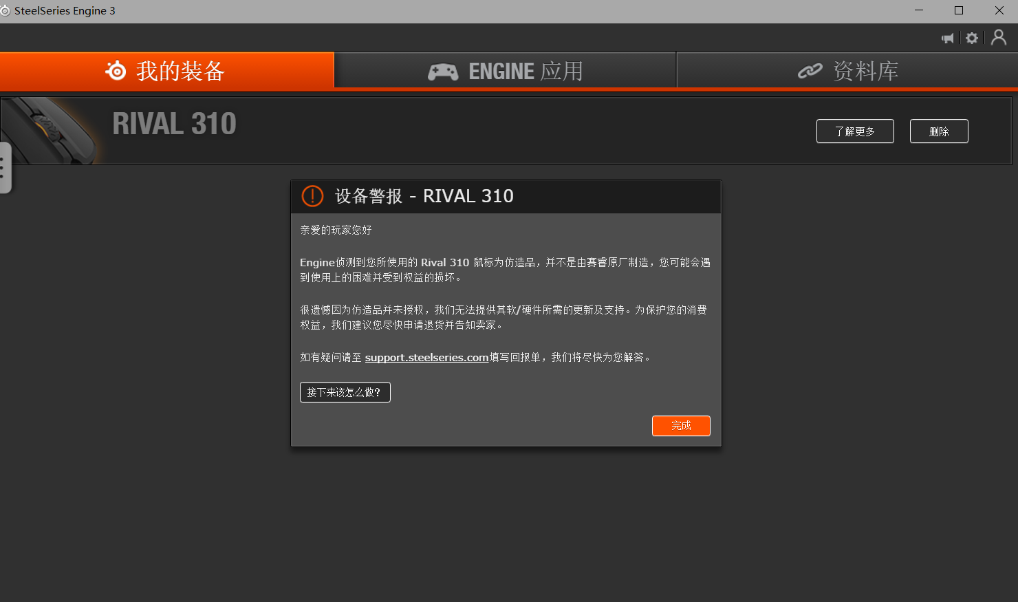 一切始于赛睿一次驱动升级,当赛睿SteelSeries Engine 3升级到3.12.6后许多310(Sensei310,rival310)鼠标用户都弹出下面的对话框。