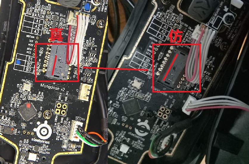 不难看出Sensei310正品搭载Truemove3引擎,而出现问题的产品却变成普通的PMW3360引擎。而且有问题版本的Sensei310主板赛睿LOGO拼写是错误的。