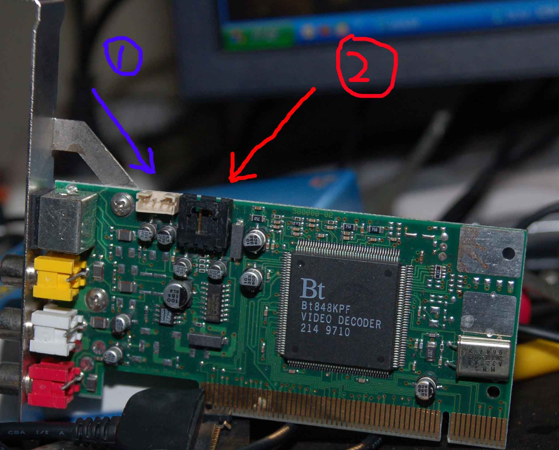 我拍了图片,发现采集卡上有两个插头,我把插头2连在声卡上,也不管用。是不是这两个插头必须连在什么地方?