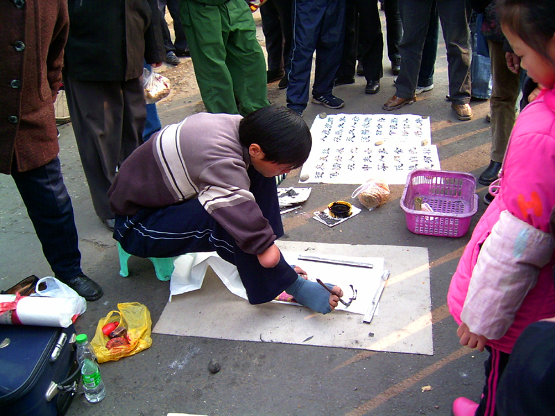 星期天上街,发现街边一个缺失双臂的青年,他熟练地用脚抽烟和写字,那脚比我们的手好像更灵活咧!