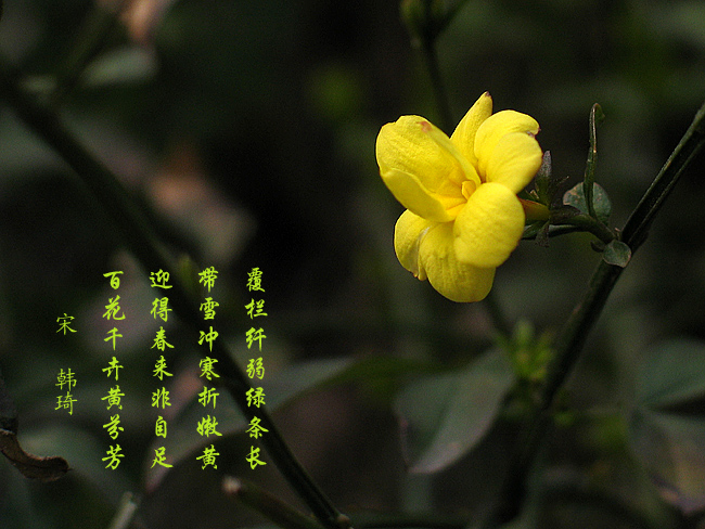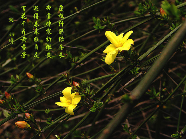 覆栏纤弱绿条长 带雪冲寒折嫩黄