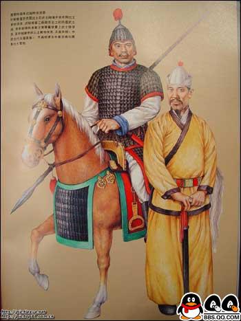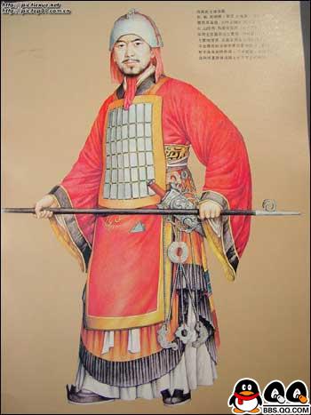 10、隋代使用最普遍的铠甲为两裆垲和明光垲。两裆垲的结构比前代有所进步,形制也有一些小的变化。一般身甲全鱼鳞等形状的小甲片编制,长度已延伸至腹部,取代了原来的皮革甲裙。身甲的下摆为弯月形、荷叶形甲片,用以保护小腹。这些改进大大增强了腰部以下的防御。明光垲的形制基本上与南北朝时期相同,只是腿裙变得更长。隋代戎服为圆领长袍。本图为隋代武士复原图。左为戎服,右为胄甲。
