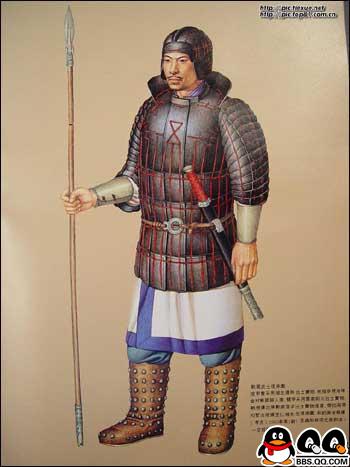 09、南北朝武士复原图。图中前排为两裆铠,长至膝上,腰部以上是胸背甲有的用小甲片编缀而成,有的用整块大甲片,甲身分前后两片,肩部及两侧用带系束。图中后排两人所穿铠甲为明光铠胸前和背后的圆护有关。因为这种圆护大多以铜铁等金属制成,并且打磨的极光,颇似镜子(护心镜)。在战场上穿明光铠,由于太阳的照射,将会发出耀眼的“明光”,故名。这种铠甲的样式很多,而且繁简不一:有的只是在裲裆的基础上前后各加两块圆护,有的则装有护肩、护膝,复杂的还有数重护肩。身甲大多长至臀部,腰间用皮带系束。