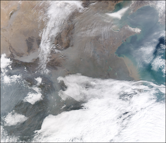 黄河入海的东中国区域可清晰看到被泥沙和烟尘污染的环境