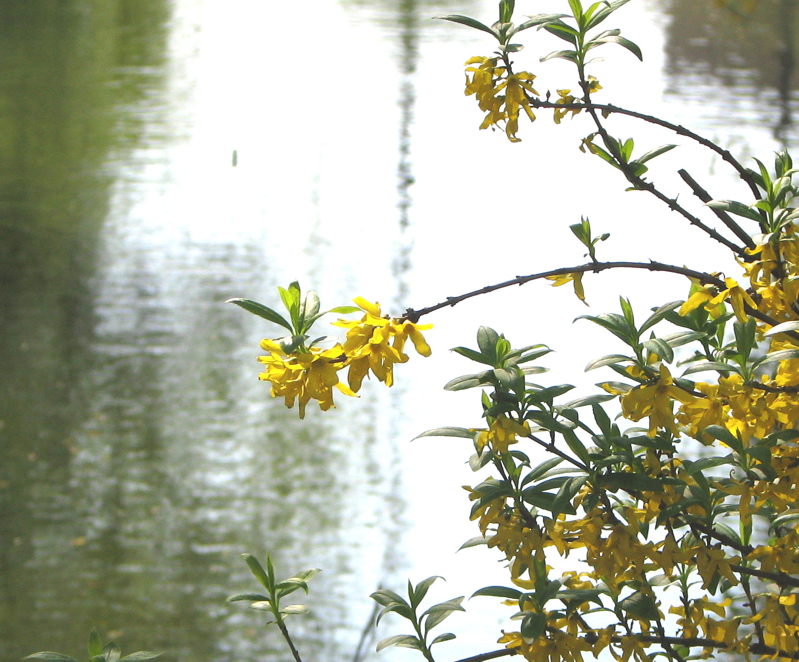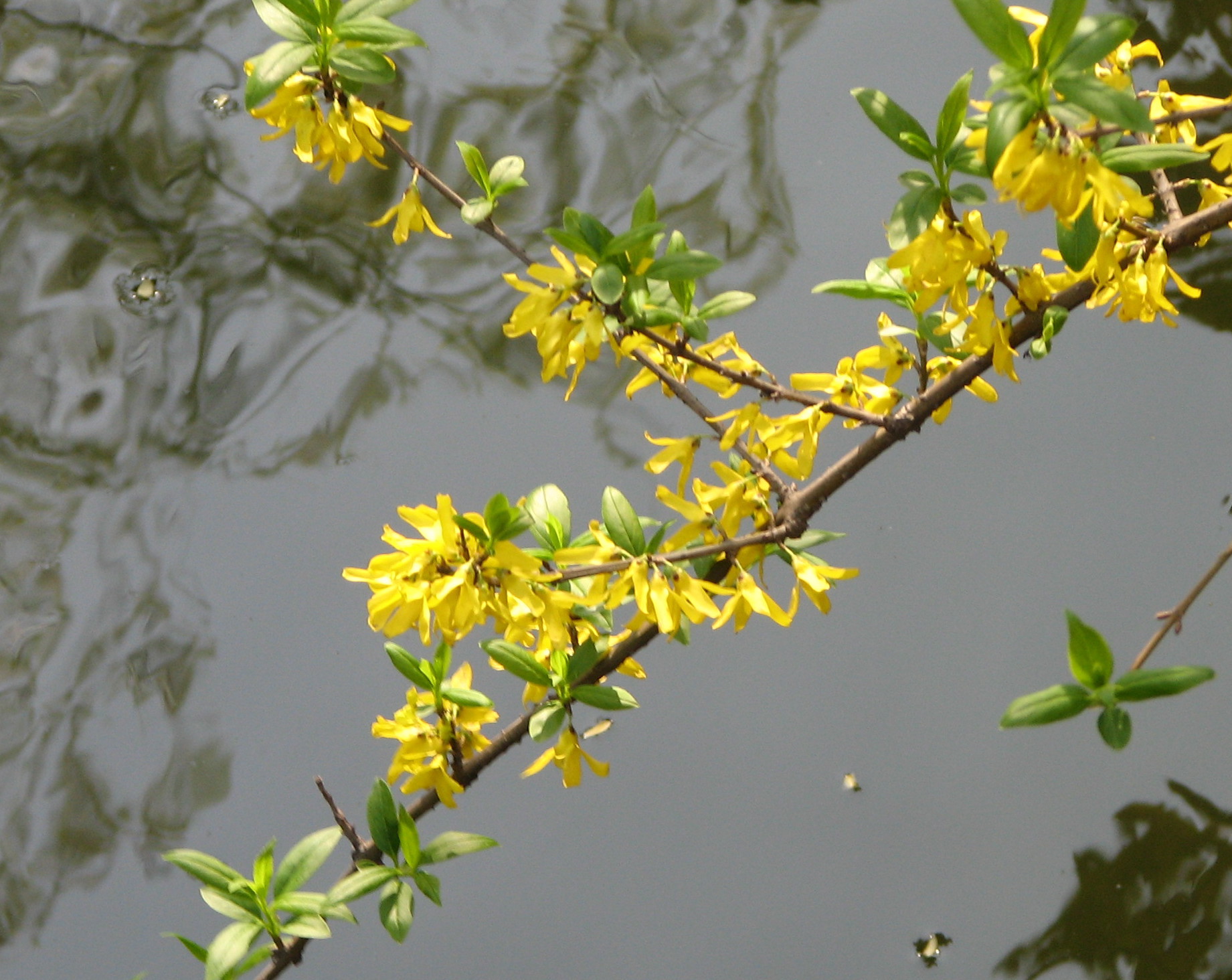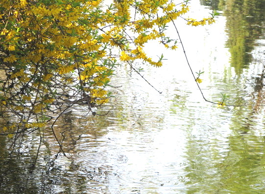 在幽静的湖岸的另一边,灿烂的迎春对镜自赏,陶醉在那春天里最金黄的色彩中,横呈披散的荆条是青春最放肆的张扬,她们绝对是以最深情的姿势担当着春天使者的角色;小洲上的紫藤也终于耐不住寂寞的羁绊,在这个洋溢着春的浓浓气息的午后,偷偷舒张开鹅卵般的花蕾;对面小岛上的芦箭在无人干扰下正迎着阳光直指蓝天……