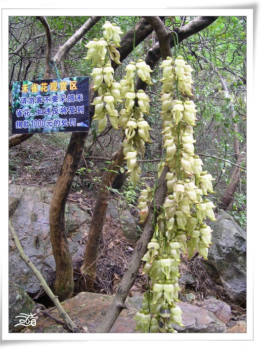 花开的季节,禾雀花吊挂成串,直接长在藤蔓上,每串二三十朵,由一青绿色小藤串连,盛开时,古藤老树下挂满禾雀花,酷似千万只禾雀栖息于林中浓荫下。蔚为奇观!