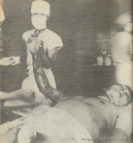 突击队员宋建平被空爆弹炸成筛状的遗体。指导员汤健康和一名突击队员正在用棉被冒着敌人的炮火掩盖上宋的遗体,以免再遭炮火伤害。柳军冲过去,拍下了宋遗体的惨状和掩盖遗体的瞬间。