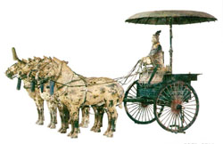 彩绘铜车。前面的一号车为双轮、单辕结构,前驾四马,车舆为横长方形,宽126厘米,进深70厘米,前面与两侧有车栏,后面留门以备上下。车舆右侧置一面盾牌,车舆前挂有一件铜弩和铜镞。车上立一圆伞,伞下站立一名高91厘米的铜御官俑。