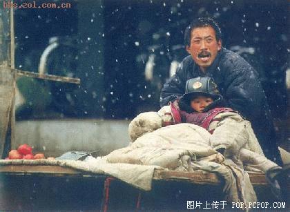 塞外的春天乍暖还寒。4月的一个早晨,天空飘洒着纷纷扬扬的雪花。一个中年男子的菜摊车上坐着一个小男孩,孩子用给菜保温的被子围着,父亲不时用手给儿子掖掖被子。作者说:“在阴暗的背景和漫天飞舞的雪花的衬托下,儿子稚嫩红润的小脸与父亲饱经沧桑的脸形成对比,父子俩面对生活的艰辛相依为命,特别是父亲使劲发出叫卖声时,脸部表情感人力度之大,使人看后心灵为之震颤 帖子相关图片: