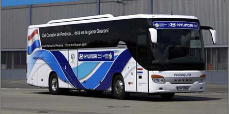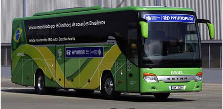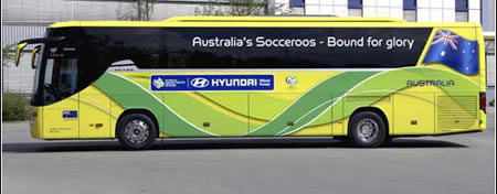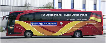 世界杯少不了汽车的秀机会,此次德国队大巴图案设计由国际足联、世界杯组委会、德国足协及国家队共同决定,波浪形主图案寓意世界杯期间德国国内甚至全世界高涨的足球热情,只在大巴最前面和最后面才能看到国旗的小图案,美国是唯一没有国旗图案的国家,其它32强大巴图片如下