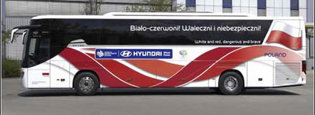 波兰队大巴,口号是white and red,dangerous and brave(白与红,威慑与勇气的象征